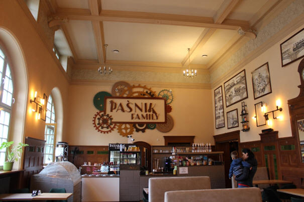 Die Bahnhofsgaststätte im prachtvoll sanierten Empfangsgebäude von Swidnica Miasto, einst Schweidnitz Hbf. Nebenan befindet sich die geräumige, mit TV-Programm versehene und reichlich mit Bänken ausgestattete Empfangshalle.