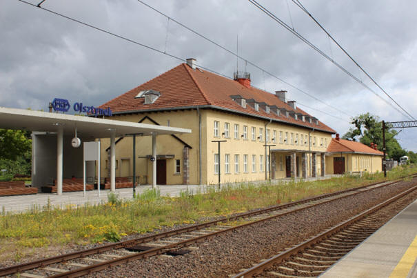 Der alte Bahnhof von Olsztynek, im Dritten Reich wegen der Besuchermassen des Tannenbergdenkmals erbaut, wird aktuell von der Stadt (7.000 Einwohner) zum Kulturzentrum umgebaut, bleibt aber Eigentum der PKP. Links der Wartebereich für den Busbahnhof.