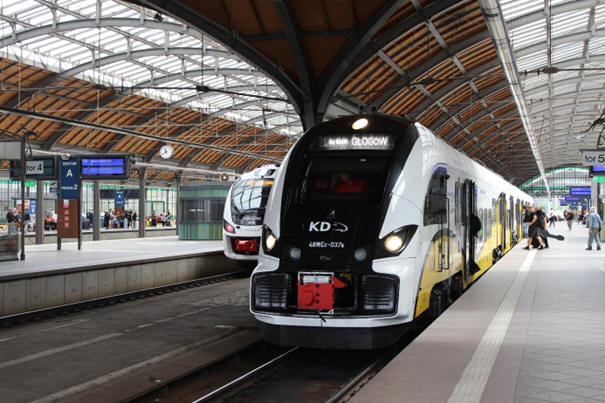 Raciborz wird über Brzeg – Opole – Kedzierzyn-Kozle angesteuert. Hier geht es, hochmodern, entlang der Oder nach Glogow. Die Stadt wird mal über Legnica – Lubin, mal über Scinawa – Wolow angesteuert. Dieser fährt über Wolow, 99 km, 1 ½ Stunden mit 18 Zwischenhalten.