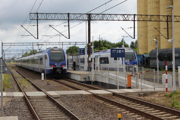 … schon ist er da. Weil im dünn besiedelten Masuren ein 2-Stunden-Takt im Fernverkehr reicht, spielt sich eine solche Szene 7-8 Mal am Tag ab. Die Züge sind von Stadler, wurden aber im polnischen Werk des Unternehmens produziert.