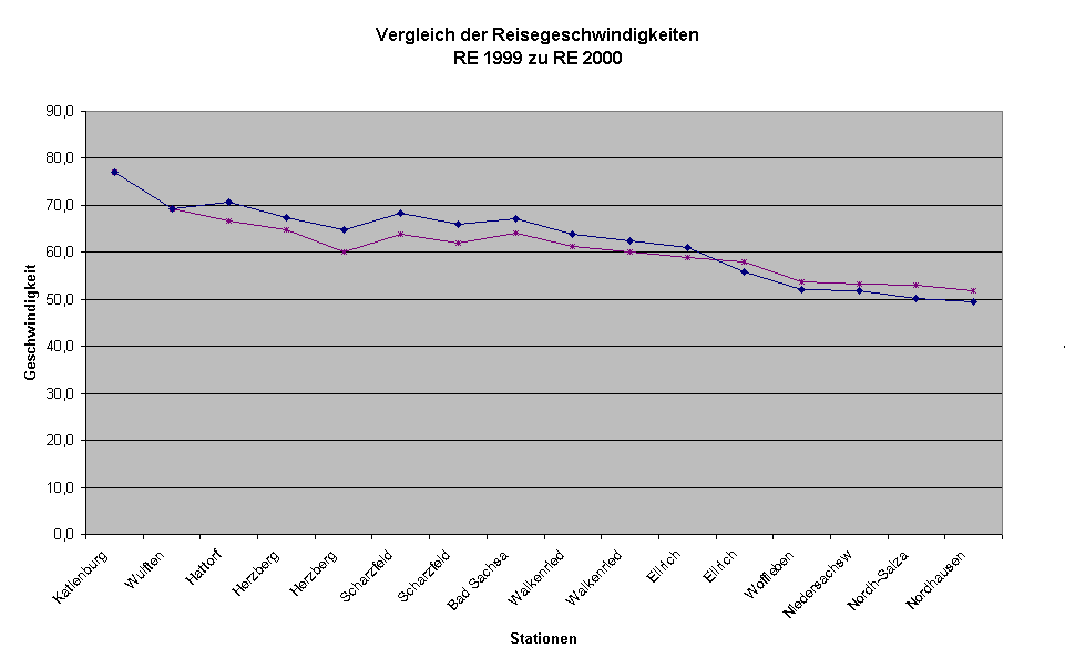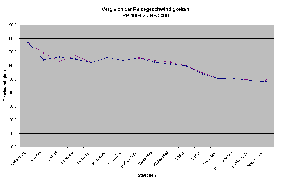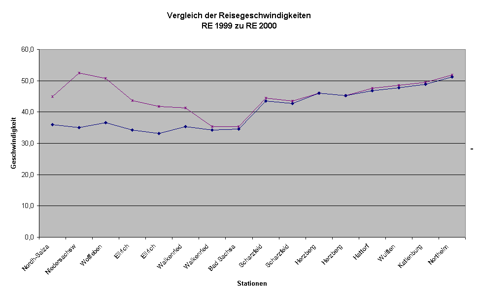 Gute Chancen also, zwischen Northeim und Nordhausen und zurück etliche Minuten an Fahrzeit einzusparen und die Fahrzeitgewinne an den Fahrgast weiterzugeben. Schließlich fordert z.B. die LNVG Niedersachsen bis 2001 eine Erhöhung der Reisegeschwindigkeit, um attraktivere Fahrpläne anbieten zu können.