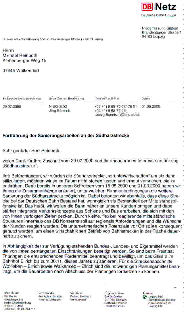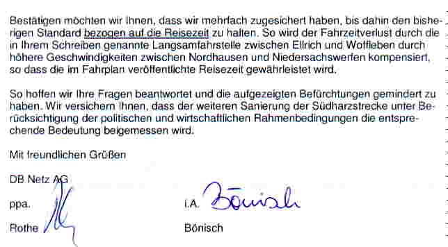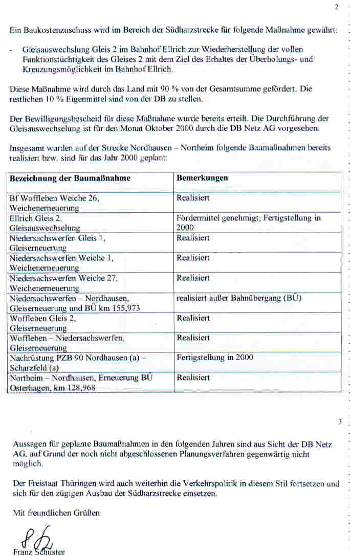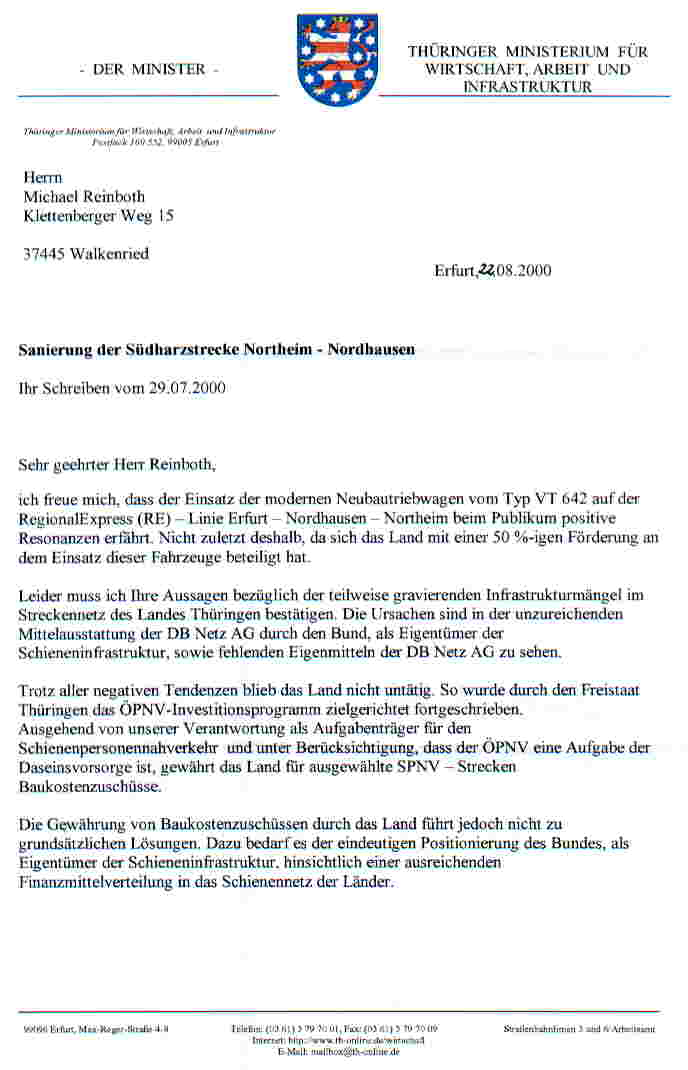 Minister Schuster (CDU) vom Thüringer Ministerium für Wirtschaft, Arbeit und Infrastruktur antwortete auf unser Schreiben sehr detailliert und zeigte die finanziellen Förderungen des Landes Thüringen für den Erhalt der Südharzstrecke auf. Unser ähnlich lautendes Schreiben an das Niedersächsische Wirtschaftsministerium wurde leider noch nicht beantwortet.