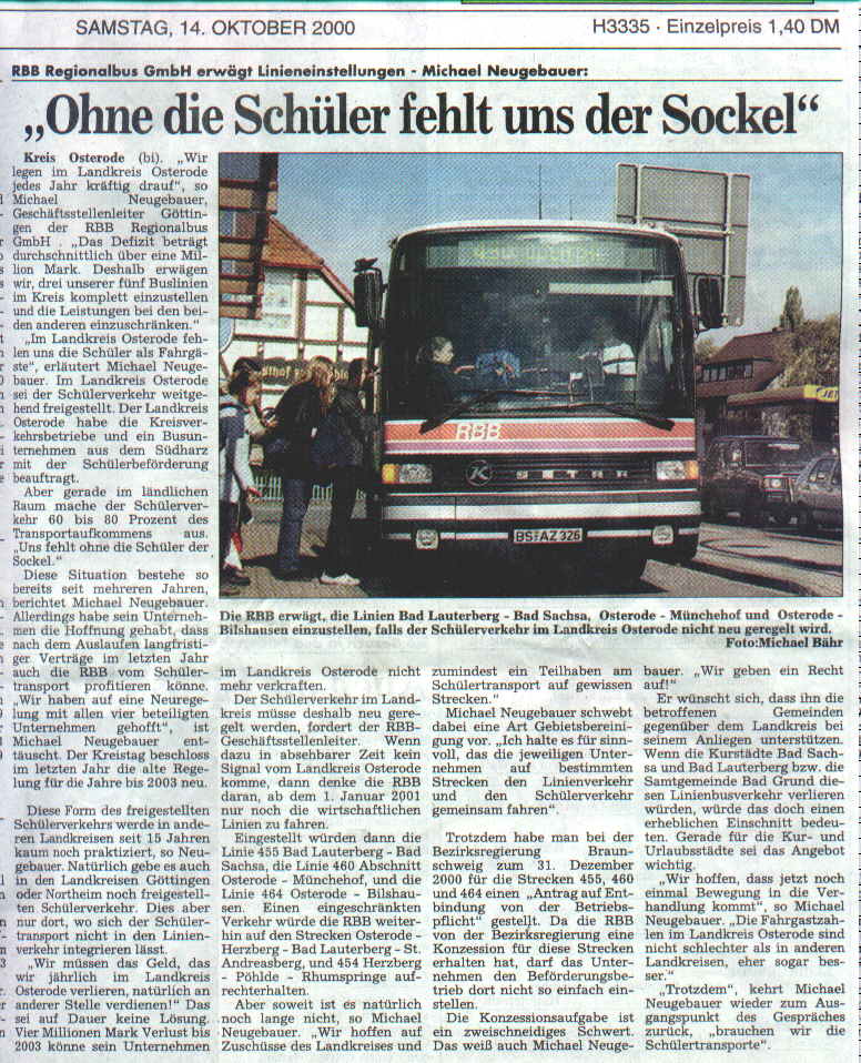 In einem Zeitungsartikel des Harz-Kurier vom 14.10.2000 (s.u.) wird von Verlusten im Busverkehr der RBB insbesondere im Landkreis OHA berichtet: