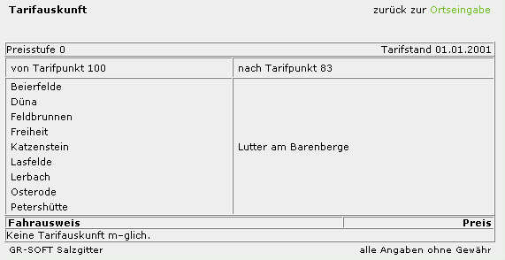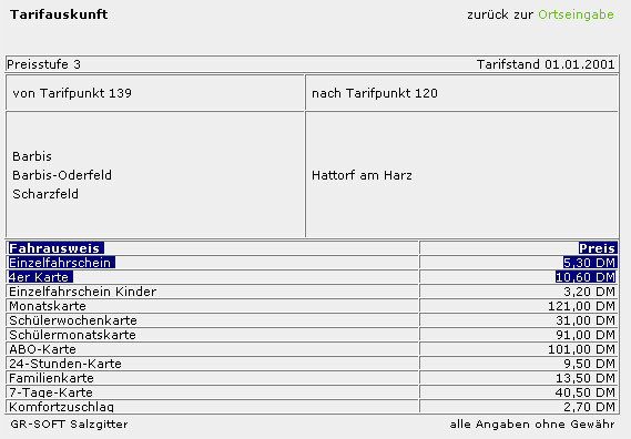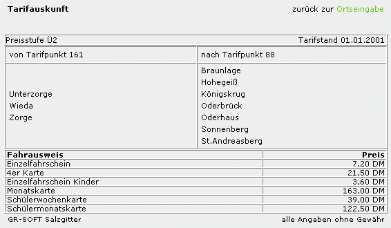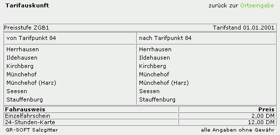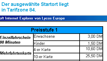 Fahrpreisauskunft von 2 DM, obwohl der Fahrpreis 3 DM (Quelle: vrb-online) für
