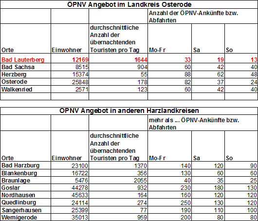 Die Mobilität ist mit dem derzeitigen ÖPNV im Kreis Osterode auch im Vergleich zu anderen Harzlandkreisen stark eingeschränkt. Dies ergab eine Untersuchung der Initiative "Höchste Eisenbahn für den Südharz", die anlässlich fehlender Verbesserungen im Nahverkehrsplan-Entwurf 2003 durchgeführt wurde. So hinken die Anbindungsqualitäten der Orte im Landkreis Osterode weit hinter denen der Nachbarlandkreise her. Das Schlusslicht bildet dabei ausgerechnet das Kneipp-Heilbad Bad Lauterberg, welches sich harzweit zu den Tourismusmagneten zählen kann. Während an Sonntagen im Südharzer Bad Lauterberg nur 13 An- bzw. Abreisemöglichkeiten existieren, stehen der Bevölkerung und den Touristen des Nordharzer Ortes Bad Harzburg mehr als 90 An- bzw. Abreisemöglichkeiten zur Verfügung. Der Sprecher der Initiative Burkhard Breme forderte in diesem Zusammenhang die Wiedereinrichtung einer durchgehenden Buslinie von Bad Lauterberg nach Braunlage und verbesserte ÖPNV Anbindungen an die Kreisstadt Osterode.