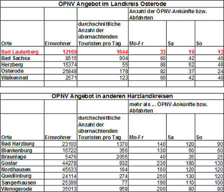 So hinken die Anbindungsqualitäten der Orte im Landkreis Osterode weit hinter denen der Nachbarlandkreise her. Das Schlusslicht bildet dabei ausgerechnet das Kneipp-Heilbad Bad Lauterberg, welches sich harzweit zu den Tourismusmagneten zählen kann. Während an Sonntagen im Südharzer Bad Lauterberg nur 13 An- bzw. Abreisemöglichkeiten existieren, stehen der Bevölkerung und den Touristen des Nordharzer Ortes Bad Harzburg mehr als 90 An- bzw. Abreisemöglichkeiten zur Verfügung. Der Sprecher der Initiative Burkhard Breme forderte in diesem Zusammenhang die Wiedereinrichtung einer durchgehenden Buslinie von Bad Lauterberg nach Braunlage und verbesserte ÖPNV Anbindungen an die Kreisstadt Osterode.