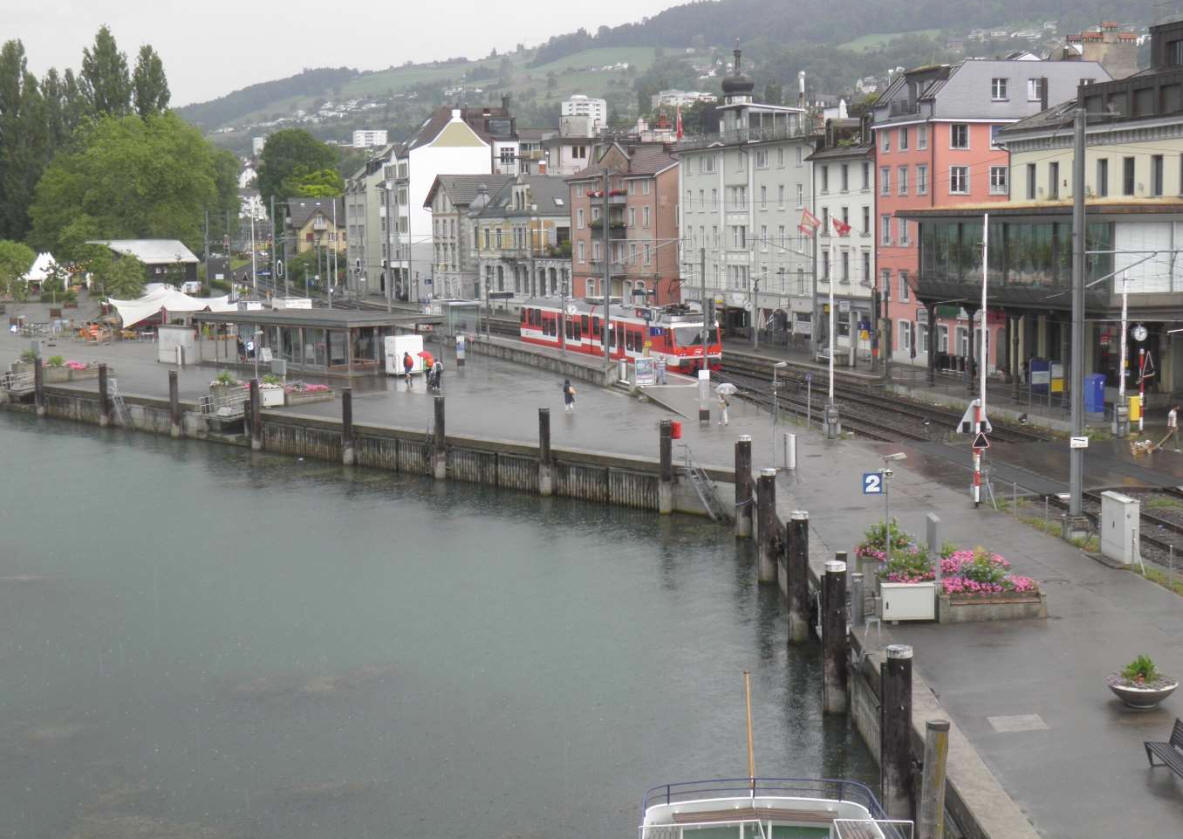 Das ist der kleine Hafenbahnhof von Rorschach am Bodensee. Wir sind in der Schweiz… Soeben ist der Triebwagen aus Heiden eingetroffen. Er fährt jede Stunde. Ansonsten fährt hier halbstündlich die S-Bahn nach Romanshorn und Weinfelden. Im eigentlichen „Hauptbahnhof“ der keine 10.000 Einwohner zählenden Stadt fährt stündlich ein IC nach Zürich – Genf und alle halbe Stunde etwas nach St. Gallen - Zürich oder St. Margrethen - Chur. Am Wochenende gibt es direkte Züge nach Lindau und zurück. Alle Anschlüsse passen zusammen. Der zweistündliche ICE nach München hält hier nicht, aber es gibt selbstredend einen passenden Anschluss in St. Margrethen. Bei diesem Angebot sind die Züge auch ohne 49-Euro-Ticket gut ausgelastet. Streiks gibt es hier übrigens auch nicht. Die berühmte Pünktlichkeit hat zwar einige Kratzer bekommen, aber es klappt schon noch – und wenn einmal nicht, wartet man kaum länger als 15 Minuten auf den nächsten Zug.