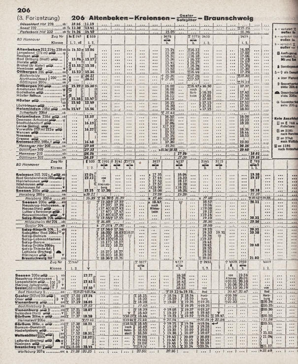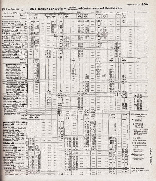 Wir schauen zunächst auf den E 534 und stellen fest, dass es sich in besagtem Bild gar nicht um diesen Zug handeln kann, sondern um den E 530, der den alten Braunschweiger Hauptbahnhof um 15.03 Uhr verließ und nach Halten in Wolfenbüttel, Börßum, Vienenburg, Goslar, Langelsheim, Seesen und Bad Gandersheim um 16.48 Kreiensen erreichte, um seine Fahrt um 17.04 über Vorwohle – Stadtoldendorf – Holzminden – Scherfede – Arnsberg – Hagen – Wuppertal – Düsseldorf nach Aachen fortzusetzen. Den E 534 Braunschweig – Altenbeken – Paderborn - Soest – Wuppertal - Aachen gab es natürlich auch, aber der hatte in Kreiensen von 10.13 bis 10.35 Aufenthalt – wir kommen noch einmal auf ihn zurück.