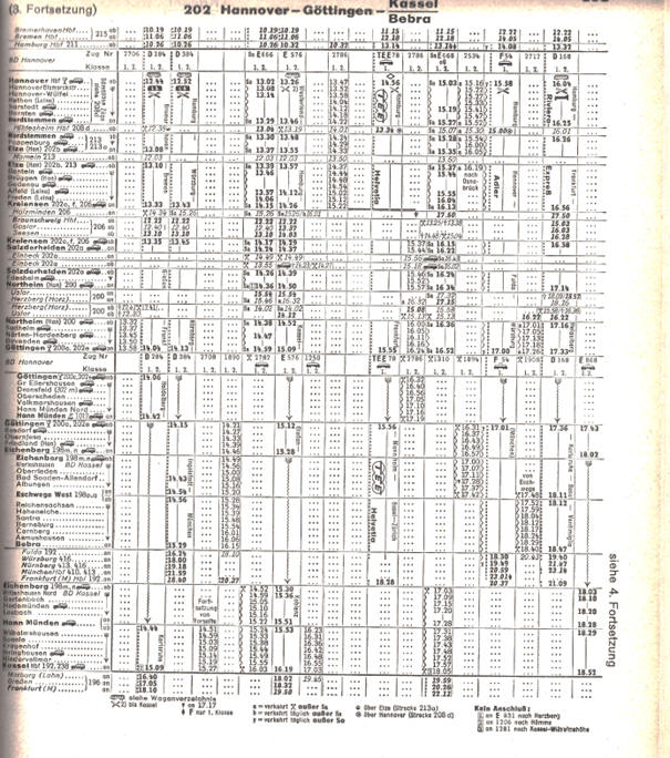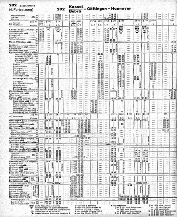 Die Tabelle 202 bildete damals und noch viele Jahre danach die Nord-Süd-Strecke ab. Wir finden ganz rechts den „Riviera-Express“ Hamburg – Ventimiglia mit Kurswagen nach Rom, der in Kreiensen Anschluss an die und von den beiden Eilzügen vermittelte. Allzu eilig hatte er es freilich nicht, denn es gab weitere Halte in Nordstemmen (wo mittels eines Triebwagens direkter Anschluss von Hildesheim bestand), Northeim (mit guten Anschlüssen aus und in den Südharz nur an Sonntagen) und Eschwege West.