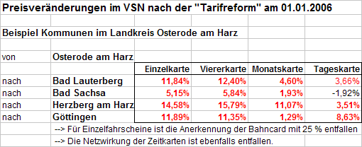 Kunden aus Herzberg und Osterode hatten bisher mit ihren Zeitkarten "Netzwirkung", d.h. sie konnten im gesamten VSN-Gebiet unterwegs sein. Nun zahlen sie mehr und haben dennoch die Netzwirkung verloren - einer der vielen "versteckten" kleinen Nachteile, die sich erst bei genauem Studium der Tariftabellen offenbaren.