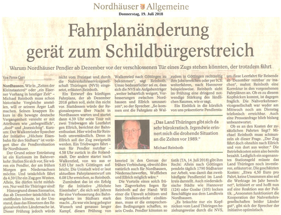 Mit dem neuen Zugfahrplan zeigt sich Gerd Aschoff, Ehrenvorsitzender des PRO BAHN Regionalverbandes Südniedersachsen, sehr zufrieden: „Die Durchbindung der Züge von Einbeck Mitte nach Göttingen und zurück in der Hauptverkehrszeit führt zu einem deutlich dichteren Takt in Nörten-Hardenberg und Northeim.“