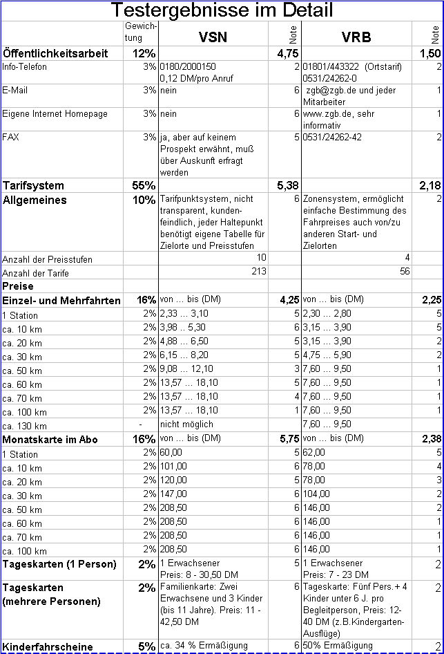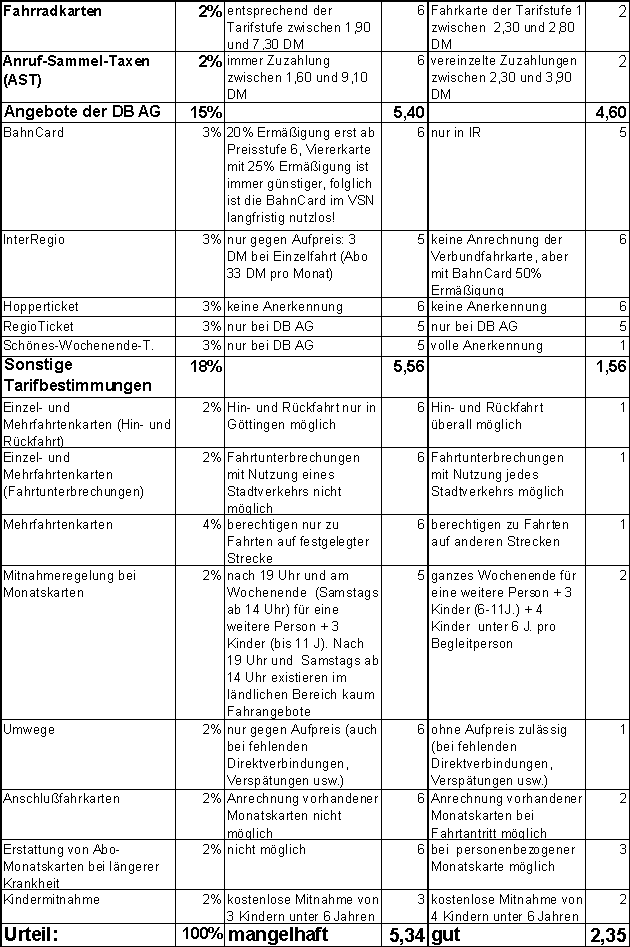 Um die Aussagen des Vergleichs jederzeit reproduzierbar zu machen, wurde zusätzlich ein Punktesystem mit Schulnoten gewählt. In diesem Punktesystem wurden die Schwerpunkte (Öffentlichkeitsarbeit, Tarife, Sonderangebote der DB AG und sonstige Tarifbestimmungen) ihrer Bedeutung nach unterschiedlich gewichtet. Auf eine Fahrplananalyse wurde hier verzichtet, weil sie den Rahmen dieser Untersuchung sprengen würde. Für den Bereich des VSN wird auf den "VSN-Praxistest 1998" von unserer Initiative verwiesen. Dort wurde die Fahrplangestaltung für den Landkreis Osterode mit der Note "mangelhaft" bewertet.